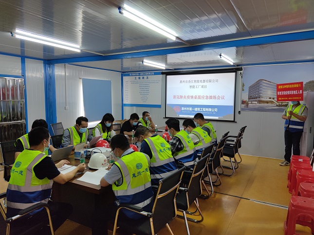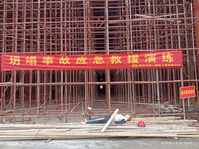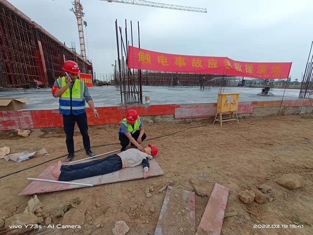 ??? 2022年3月19日下午,我司項目應急救援隊伍在惠州香江智能工廠項目施工現場組織高處墜落、觸電、坍塌、防疫等事故應急救援演練。