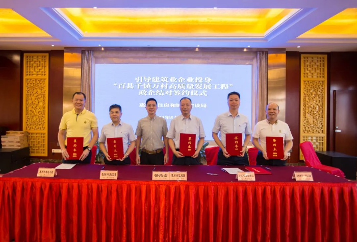 為深入學習貫徹習近平新時代中國特色社會主義思想,按照廣東省委、省政府關于實施“百縣千鎮萬村高質量發展工程”(以下簡稱“百千萬工程”)相關部署,2023年5月15日,廣東省住房城鄉建設廳在惠州市召開引導建筑業企業投身“百千萬工程” 工作推進會(珠三角片區)。我司陳小勇董事長在會上認真聽取了“百千萬工程”的階段工作進展情況,表示將積極響應政府工作號召,充分發揮企業資金、材料、技術等優勢投身到“百千萬工程”中,并與惠州市住房和城鄉建設局簽署了政企結對合作協議。